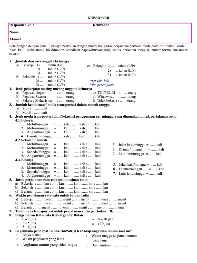 Sehingga jelas bahwa format dan rancangan kuesioner harus tersusun rapi dan mudah dalam pengisian kuesioner (malhotra, 2012: Measurement of asset and liabilities. Format kuesioner ii fakultas teknik universitas indonesia program sarjana ekstensi penerapan pengendalian resiko., ronny hutabarat, ft ui, 2008. Kuesioner sering digunakan oleh mahasiswa tingkat akhir untuk melakukan penelitian, baik kuantitatif maupun kualitatif. Contoh kuesioner penelitian / angket penelitian.